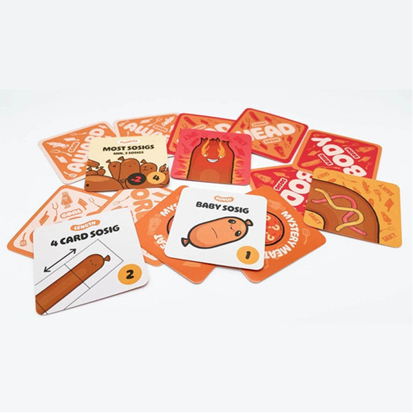 In Sosig, players draw tiles and add them to their board to build various sosigs that meet order requirements and earn them points. You can also earn extra points by winning the reward tile at the end of the game. Players attempt to fulfill orders, disrupt their opponents' sosigs, and accumulate the most points on their board, avoiding incomplete sosigs to avoid earning negative points. Once the last card from one of the decks is played, the game is over, and the player with the most points wins.